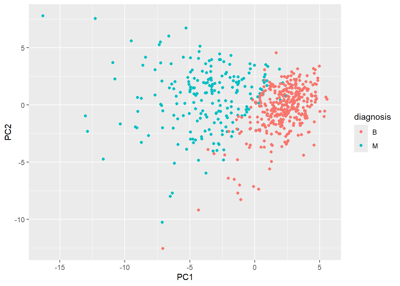 I noticed that in this plot, PC1 appears to be flipped relative to the x-plane and is now upside down compared to the first plot. I notice that in both plots, there’s still a pretty clear distinction between diagnosis “B” and “M”.