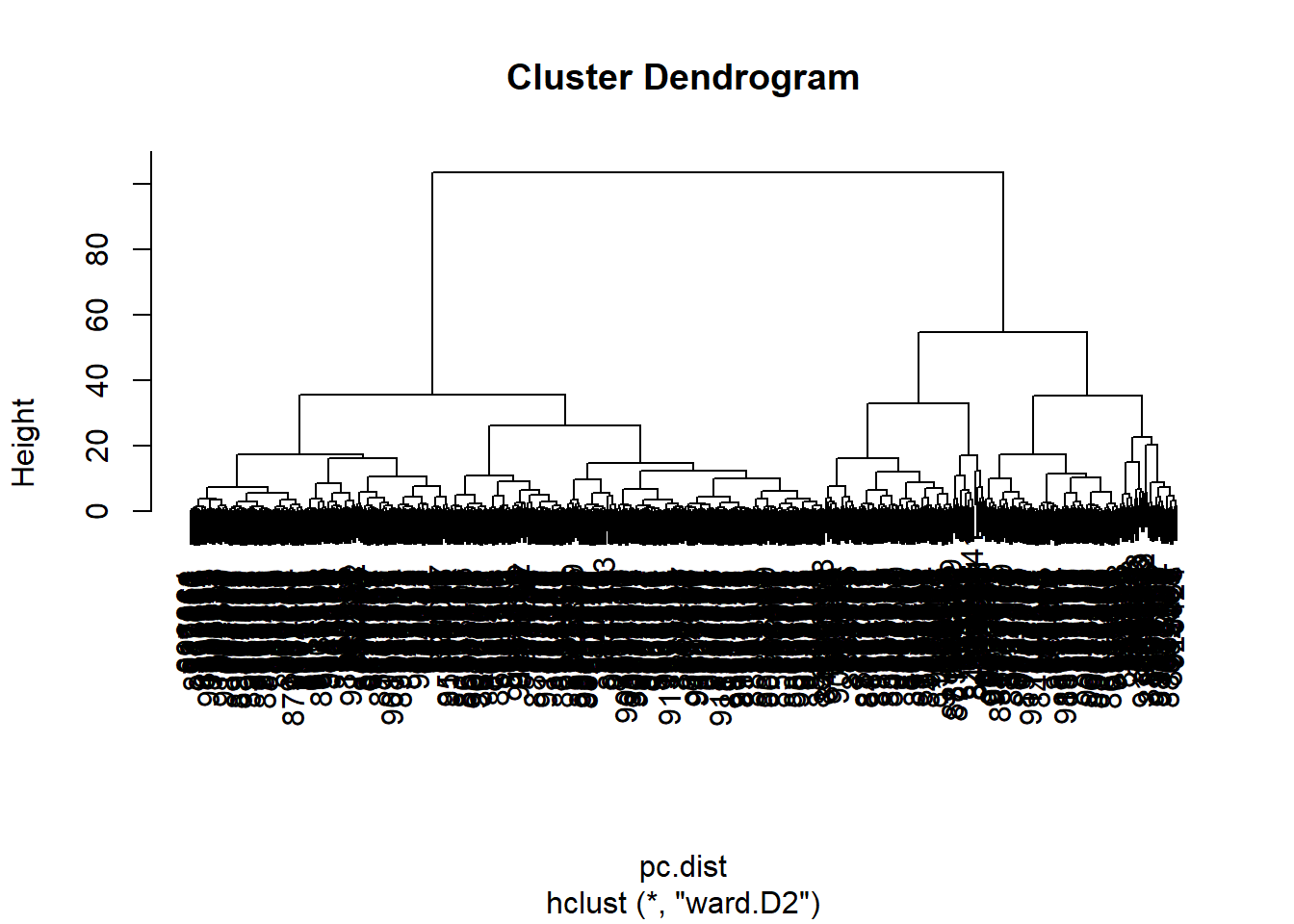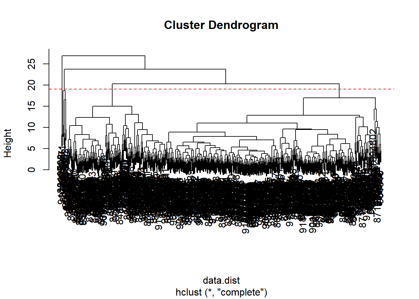 data.scaled <- scale(wisc.data)data.dist <- dist(data.scaled)wisc.hclust <- hclust(data.dist, method = "complete")plot(wisc.hclust)