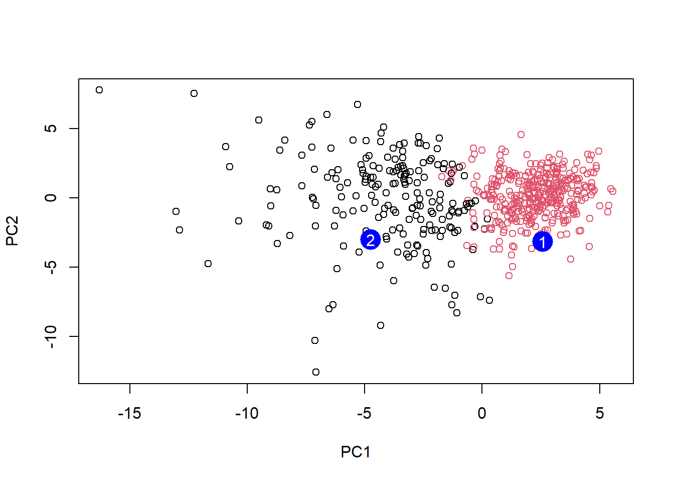 text(npc[,1], npc[,2], c(1,2), col="white")